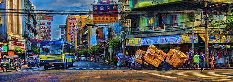 It was hard to find a focal point that merited a photo. I tried to look for a ‘minimalist’ view of Bangkok. Bangkok was so full of stuff, that even a minimalist view was difficult. By a minimalist view I mean a photo of a detail on a building, or the snarled electric lines wrapping buildings and street lights. I did like the shabby, old colonial buildings and I shot them, but they didn’t ‘translate’. No life. You’ve got to have ‘life’ even if it is just a shaft of light or smoke or a tattered poster on the wall. Thank goodness for Photoshop. The color brings the scene to life.