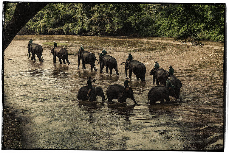 This was shot at an elephant camp near Chaing Rai. The mahouts had just finished scrubbing and sloshing the elephants. It looked like fun. The elephants helped out by shooting water from their trunks over their head onto the mahout. The barefoot mahouts clambered over the animals as they worked. I didn’t see one fall into the river.