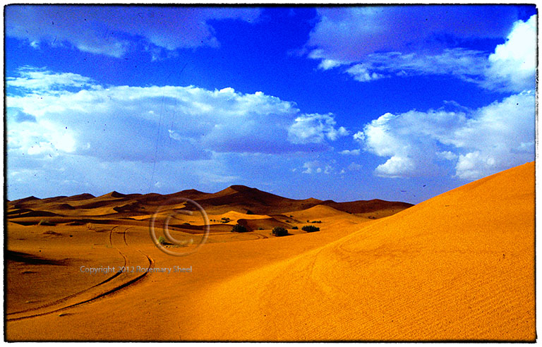 It was difficult to get these colors “true”, but I finally managed using Image>Adjustments>Color Balance. The dunes change color according to the time of day going from a pale beige to yellow to pink in the evenings. In mid-day, when the sand isn’t blowing, the sky can be almost this blue and the sand almost this yellow.