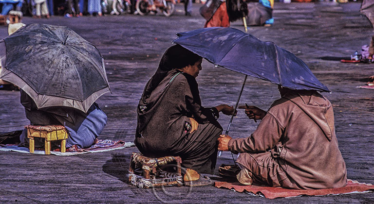 The Moroccans sit under an umbrella yet they wear several layers of clothing including the ankle-length jellaba. They avoid the sun. I noticed that if there is a sidewalk cafe, they will eschew those outdoor tables for the one in the basement where they know it will be cool. Once I was in the desert photographing nomads. I was standing in the sun without a hat and an old woman came out of the tent. She pointed to the sky and said, in a scolding voice, “Shams!!” It means ‘sun’ in Arabic and she meant, ‘get out of the sun!’ I’m sure she thought I was crazy.