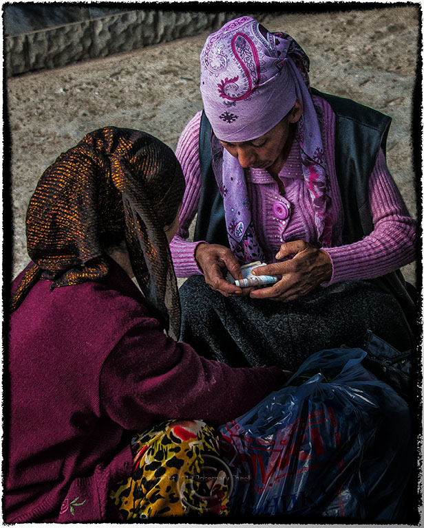 Gypsies congregated at the market’s edge telling fortunes. Here a gypsy woman folds Uzbek bills into a fist sized package. The body language of the woman facing away from us seems to say that she needs to know more, but the woman with the money has her mind on other things.