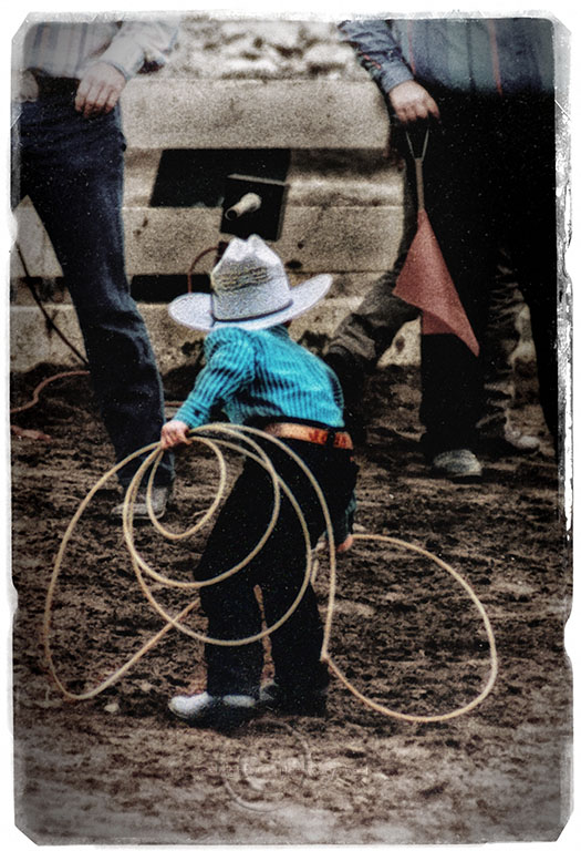 This little boy, maybe 5 years old, is a ‘natural’. Look at his body language. You can feel his concentration. If he weren’t under three feet tall, you’d think he had been roping for years. I’ve got several photos of boys like this one. Boys who grow up on ranches, who learn ranching by working with their fathers. They are not little boys. They are little men.