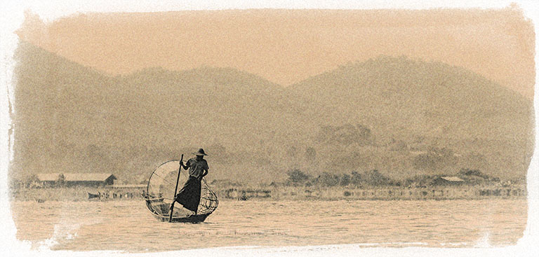 Since I had shot hundreds if not thousands of photos of the Inle Lake fishermen, odds were that I had a similar shot. And sure enough, I did. On the very last day, as our long-tailed boat shot us toward the landing I grabbed this shot. We had left the hotel early. The morning haze hadn’t dissipated leaving the lake and mountains a landscape of shades of gray.