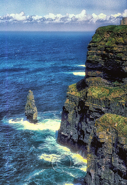 My husband was realizing a dream by playing golf at Ballybunion and I walked along a narrow path a foot or two from the edge of the Cliffs of Moher. A strong, cold wind blew off the ocean. The wind was stong, but not strong enough to blow a person off the cliff into the crashing seas, although signs along the way proclaimed that it had happened.