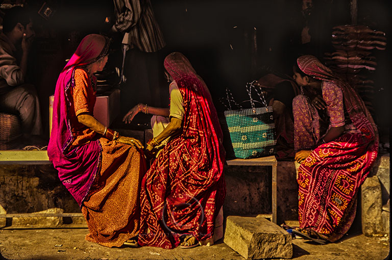 The two women on the left form the letter ‘U’. Perfect! The body of the woman on the right forms a flowing reverse ‘C’. The viewer’s eye moves through the scene and back again. The lines of the women are unified by the softly draped red fabric. Even though we cannot see the women’s faces, we know they are concentrating on something in the shop. Their body language tells us that they are making an important decision.