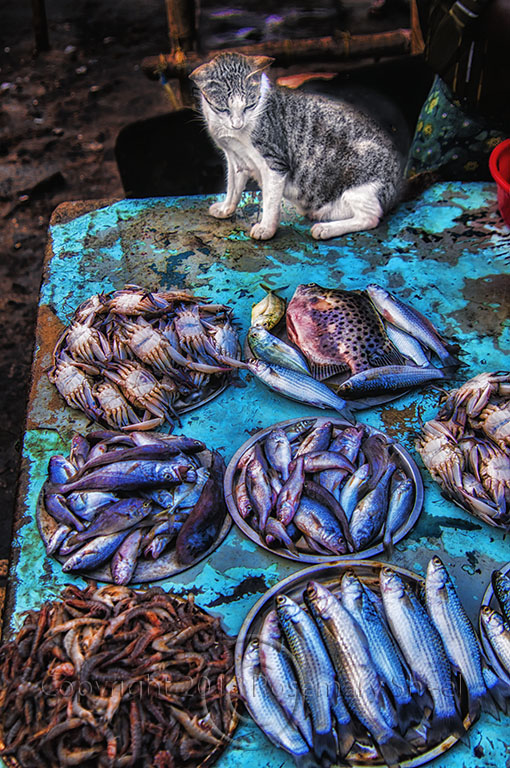 The fishermen had their tables under some leafy trees. It was after sunset and there was very little light. I increased my ISO for a better exposure and fired off three shots trying to compose the cat and the fish to tell the story without words.