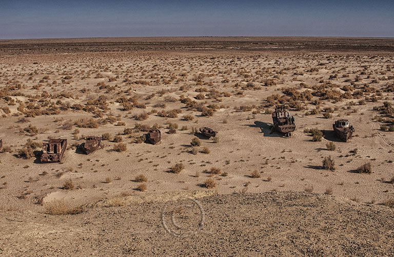 The lake had provided one-sixth of the fish, including sturgeon, used or eaten in the Soviet Union. Now the fishing industry is dead. Fish species unique to the Aral Sea have died out. The fishermen have gone to Kazakhstan to work but their families still live in Moynaq which is almost a ghost town. You can’t even buy a cup of tea there.