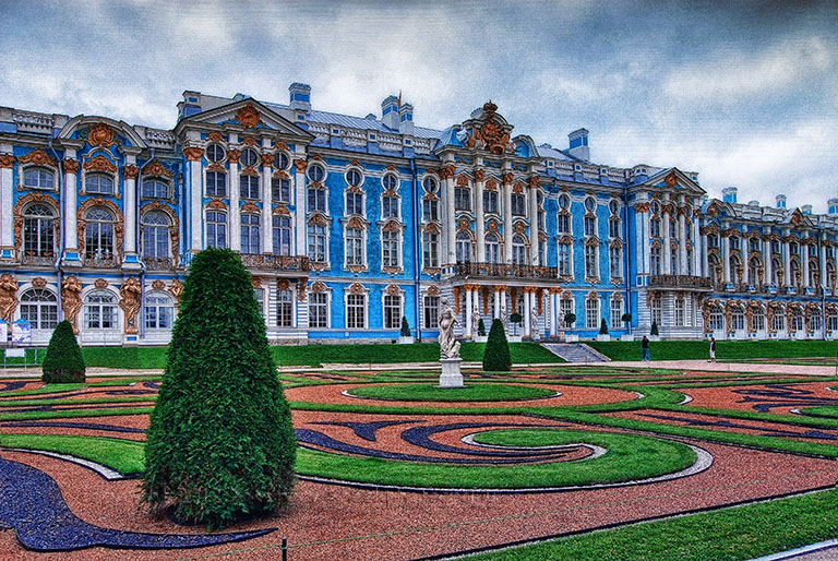 The palace, called the Catherine Palace, is named for the wife of Peter the Great. Originally it was a small residence. Empress Marie, the daughter of Peter and Catherine I, built the huge palace that you see in the photo. She spared no expense to make her palace more beautiful than Versailles. She had used nearly 300 pounds of gold to decorate the exterior by the time the palace was completed in 1756.