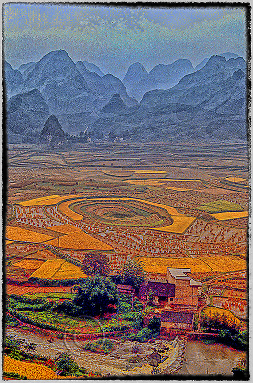 I remember our leader, Keren, remarking about the unusual circular rice paddy. My eye kept going to the farmstead in the foreground and I tried to make the image flow from the thousand hills to the rice paddies and farm house at the bottom. I was unimpressed with the photo until I Photoshopped it to this colorful “fairytale”. I love what ‘post-processing’ did to the colors. The mountains have come alive and so has my little farmer’s house. There is some noise at the top of the photo, but I don’t mind. It looks as if paint has dripped down and I like it. The colors are unbelievable. It seems as if anything goes these days and not just in photography. Good? Or Bad?