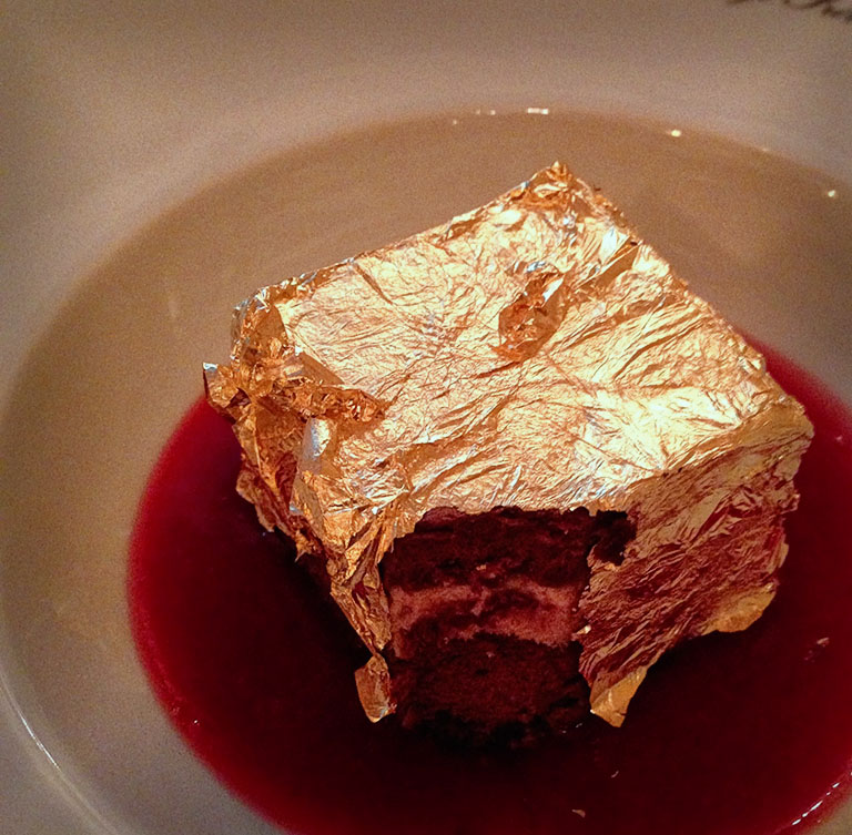 “The cake is called Carre d’Or – and is coated with gold leaf. It was delicious, though I couldn’t taste the gold, only the creamy chocolate. I recommend it – get it at Mariage-Freres (http://www.mariagefreres.com/